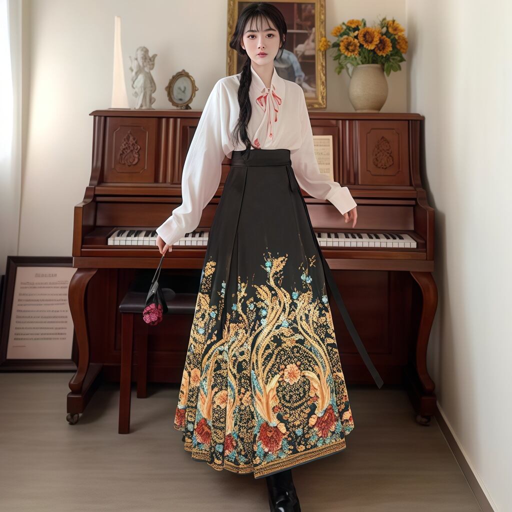 スカート レディース 漢服 馬面 プリーツ ロング丈 ボリュームフレア 鳳凰柄 ポリエステル 黒 配色デザイン 春夏 普段使い お出かけ シワになりにくい
