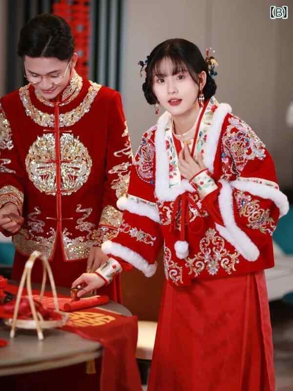 ドレス レディース 花嫁 ウェディングドレス 中国風 結婚式 披露宴 お色直し エンゲージメント 結納 明朝風 秀禾服 改良漢服 馬面スカート ロング丈 スタンドカラー 長袖 刺繍 ポリエステル スリムフィット