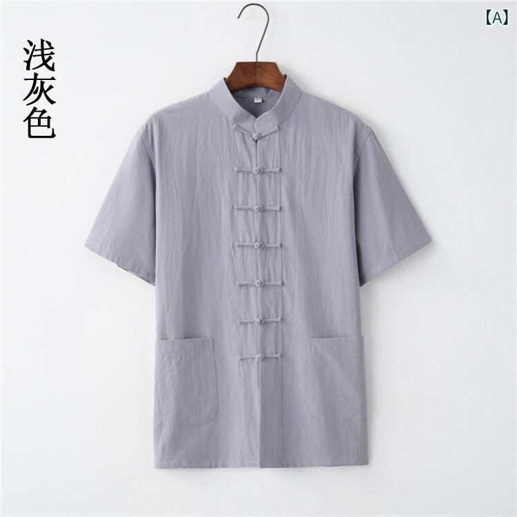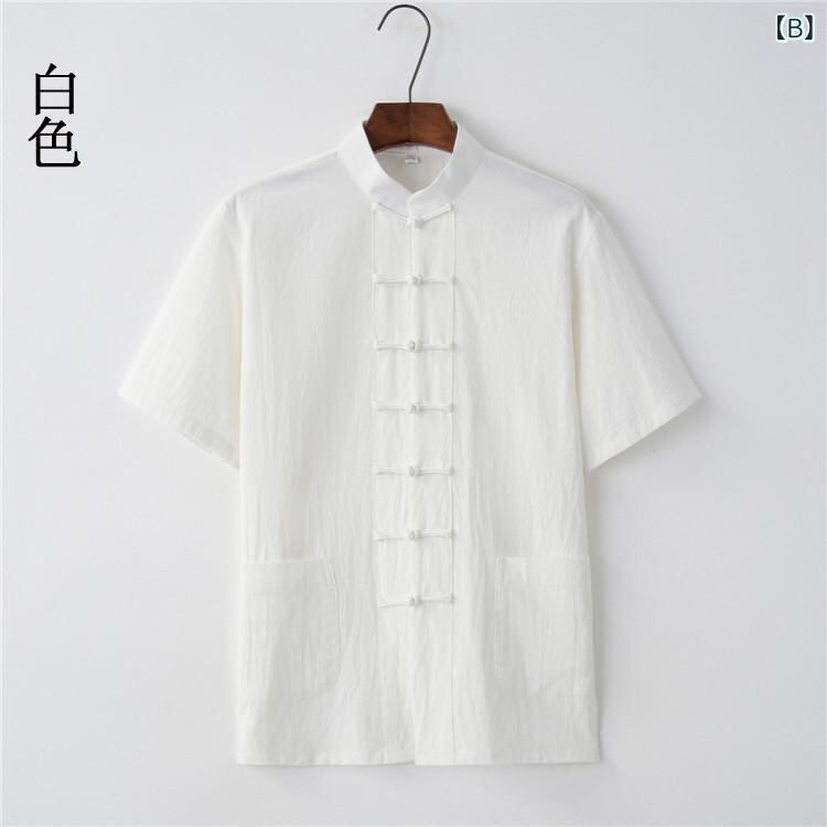Tシャツ メンズ 中高年 中国風 綿麻 半袖 ウォッシュ加工 カジュアル 太極拳 カンフー 茶道用 普段使い リラックス ボタン付き 通気性 吸湿速乾