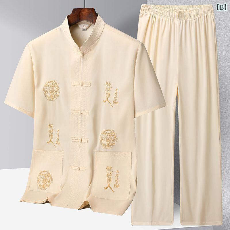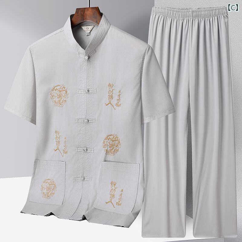 セットアップ メンズ お父さん世代 夏用 半袖 中華風 唐装 シャツ レトロスタイル ポリエステル混紡 通気性 軽量 カジュアル 普段使い リラックスウェア