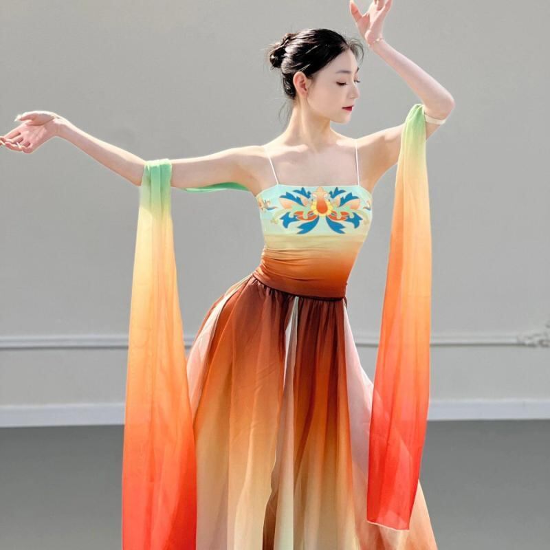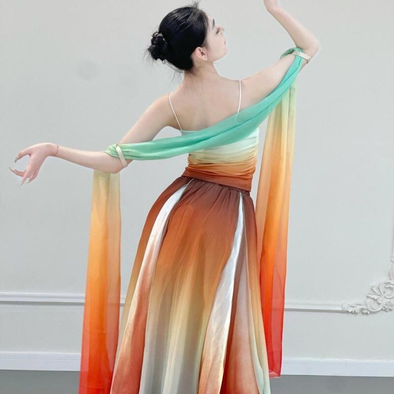 ダンス衣装 レディース 敦煌風 飛天 古典舞踊 民族衣装 舞踊着 披帛 ショール インナーセット ロングスカート セットアップ エスニック 軽やか 優雅 華やか エレガント 舞台 発表会 練習着 撮影 イベント 演出服 コスチューム