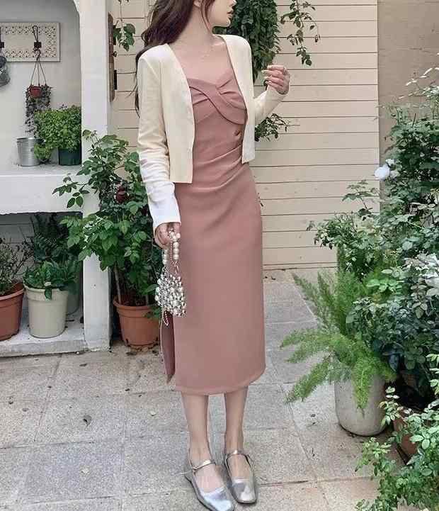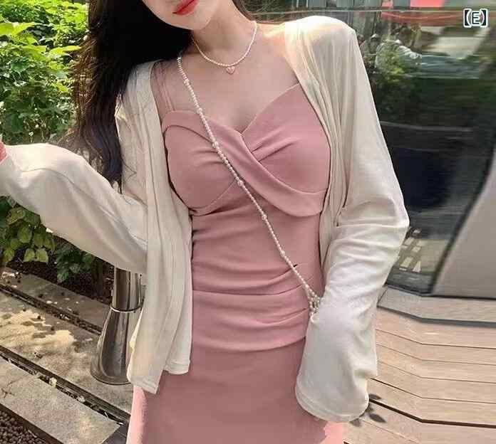 セットアップ レディース 大きいサイズ ゆったりサイズ キャミソールワンピース カーディガン 2点セット フレンチスタイル 純欲 Vネック Aライン ノースリーブ ウエストマーク 細見え ミディ丈 ポリエステル 普段使い