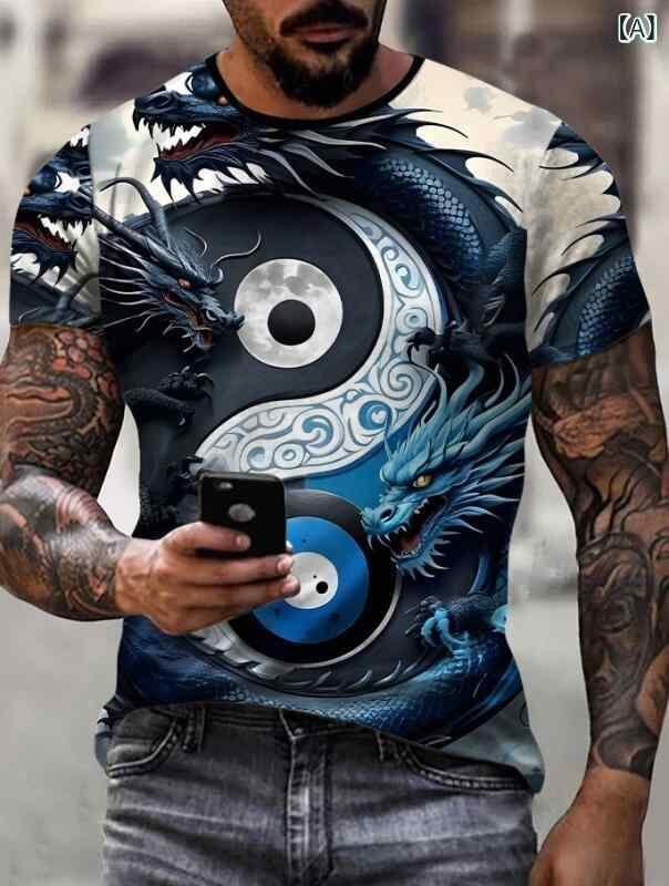 Tシャツ メンズ 太極八卦 陰陽太極図 3Dプリント 半袖 クルーネック ポリエステル 吸湿速乾 カジュアル ストレートシルエット ビッグサイズ 普段使い オールシーズン