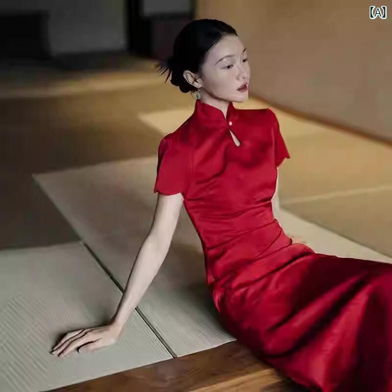 チャイナドレス レディース 花嫁 披露宴ドレス 赤色 中国風 改良型 スリムフィット ロング丈 ポリエステル素材 ラウンドネック 半袖 スリット入り レトロ クラシカル 花柄 プリント