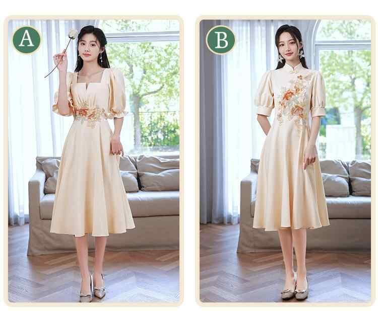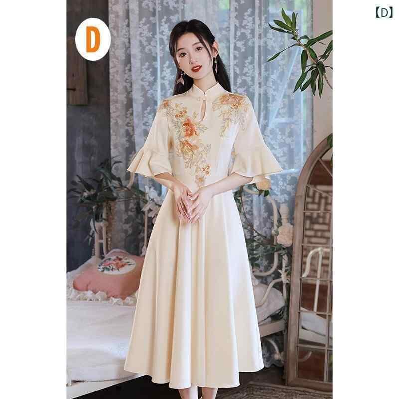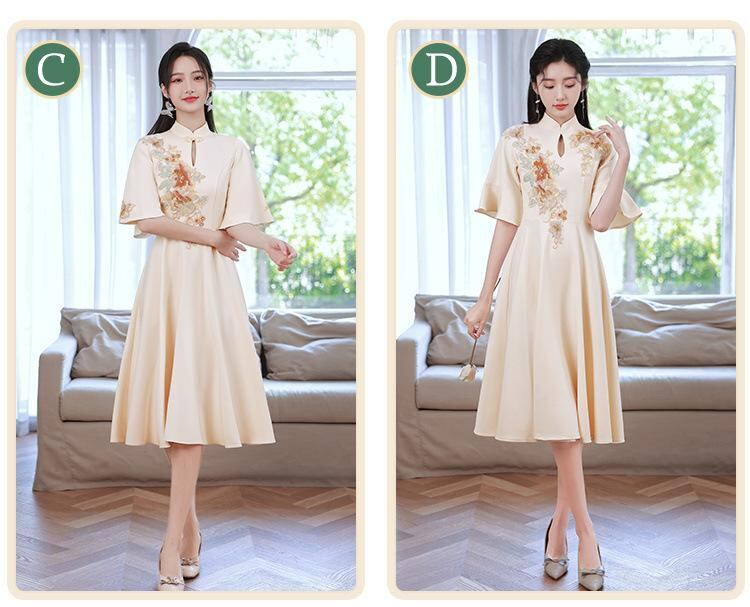 チャイナドレス レディース ブライズメイドドレス 結婚式 披露宴 大きいサイズ ゆったり 細見え 体型カバー 普段使い カジュアル スタンドカラー 五分袖 ミモレ丈 ポリエステル シャンパンカラー ベージュ