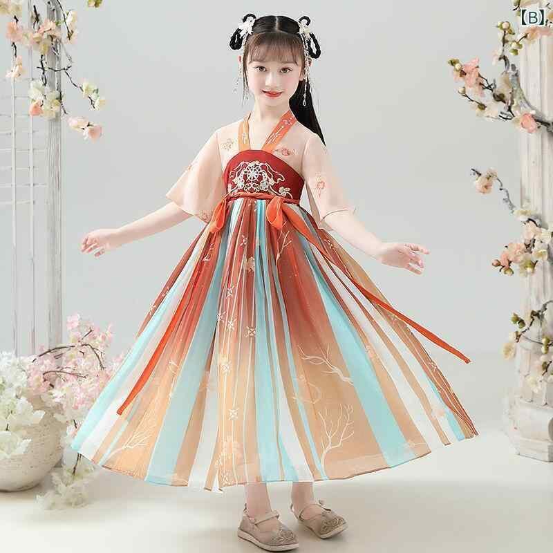 漢服 女の子 夏用 中国風 優雅な古典衣装 ロング丈 Aライン ドレス イベント 発表会 涼しい 快適 シフォン ポリエステル 再生繊維 オレンジ グリーン