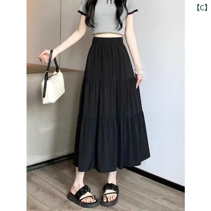 スカート レディース ホワイト ウエストゴム ハイウエスト 体型カバー 着痩せ ミディ丈 ティアード フレアスカート ポリエステル 素材 Aライン カジュアルスタイル