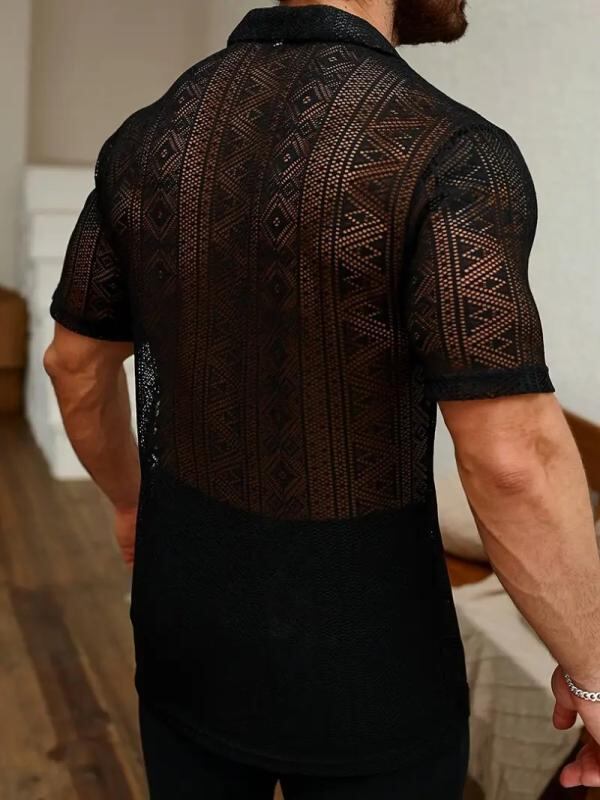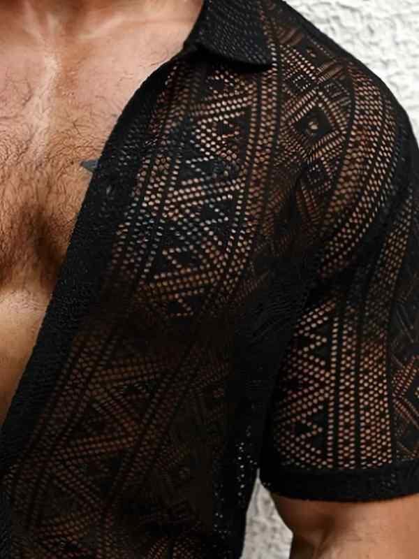 シャツ トップス メンズ 男性用 レース シースルー 透け感 半袖 カジュアル 夏用 ストリート 欧米スタイル ポリエステル 通気性 普段使い 襟付き レギュラーフィット ブラック