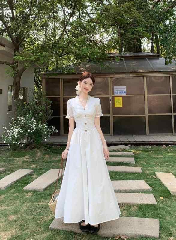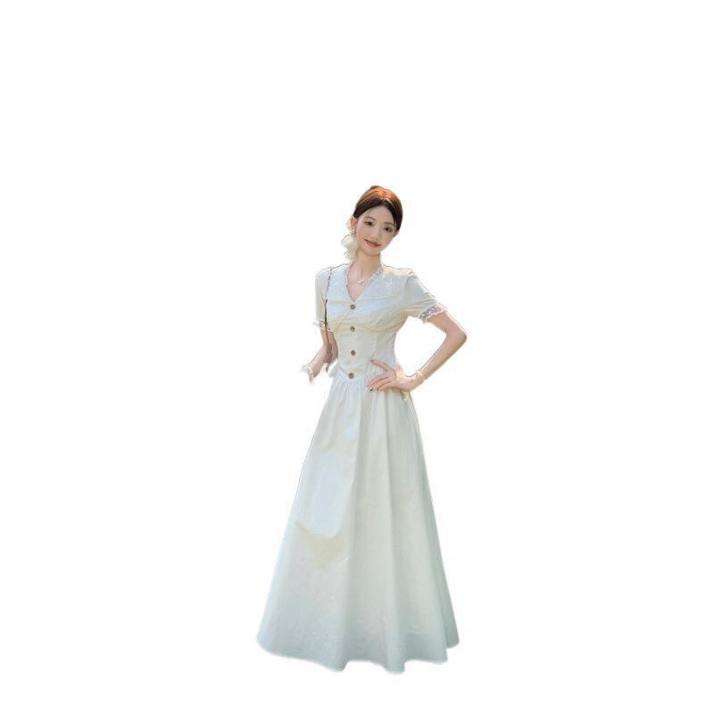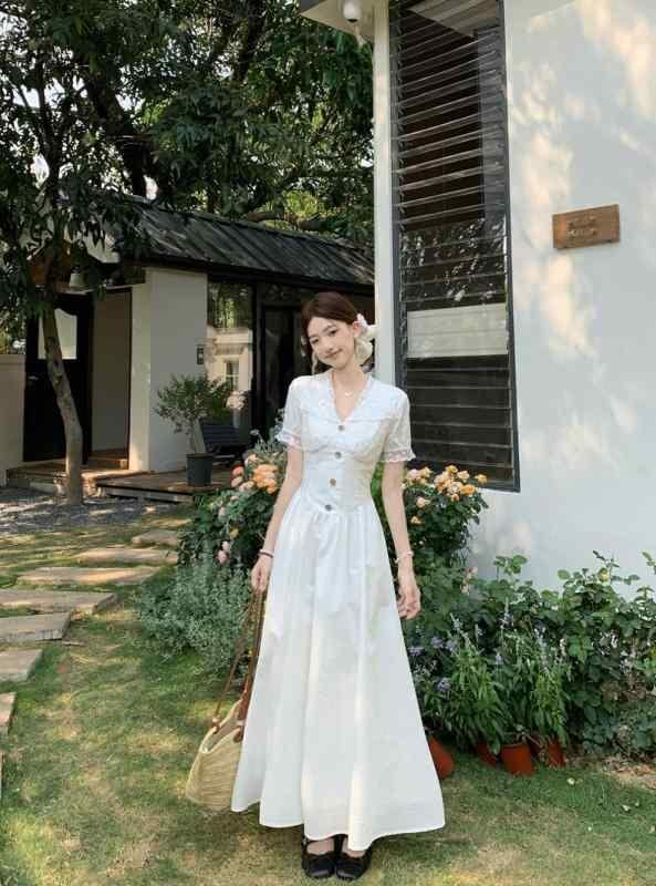 ワンピース レディース フレンチエレガント レース切り替え 半袖 Vネック ハイウエスト ウエストシェイプ 細見え 着痩せ Aライン ロング丈 通勤 オフィススタイル ボタンデザイン ポリエステル ホワイト