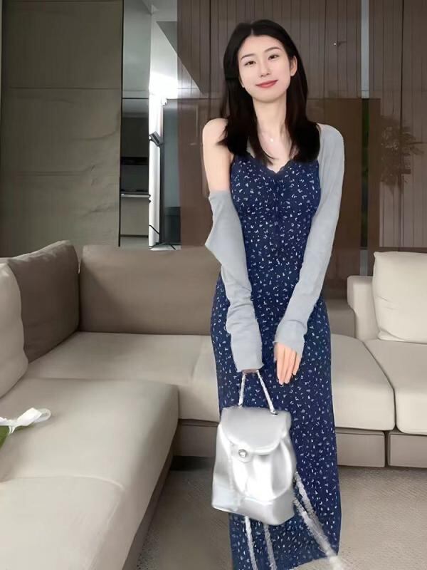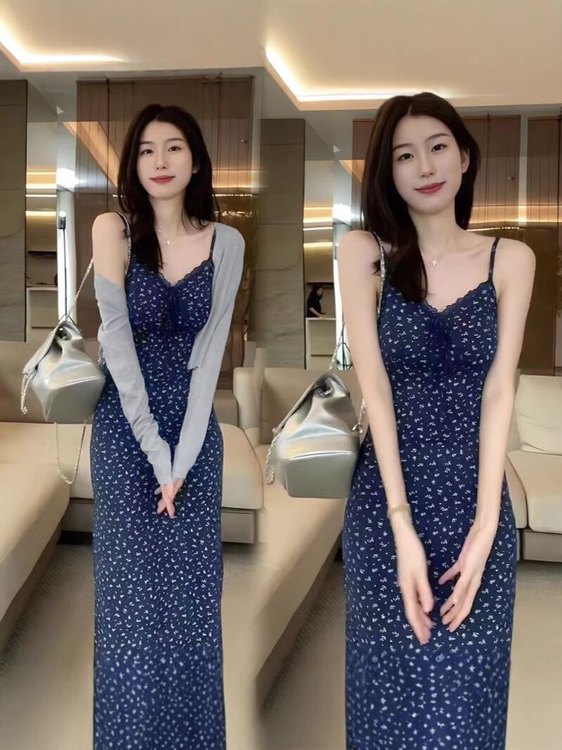 ワンピース レディース 韓国ファッション 小花柄 キャミソールワンピース 開襟トップス 2点セット ウエストマーク 細見え ロング丈 Vネック ハイウエスト ポリエステル タイトシルエット 上品 きれいめ 大人可愛い フェミニン お出かけ デート