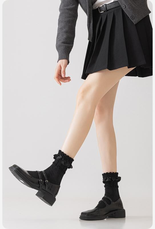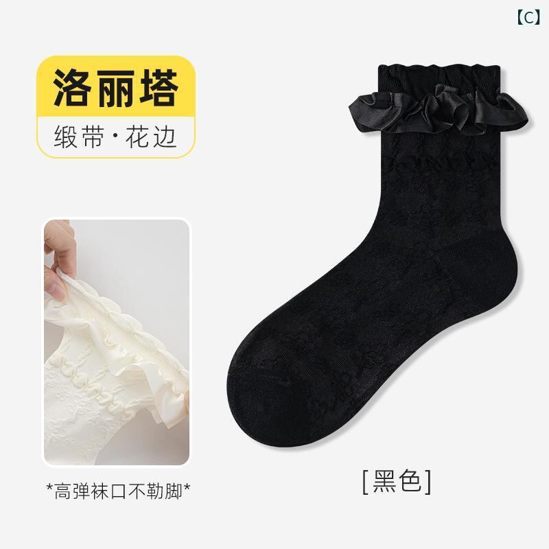 ソックス レディース オールシーズン ハイソックス フリル レース メッシュ 通気性 綿 吸汗 防臭 抗菌 ロリータ風 無縫製 カジュアル 無地 オフホワイト ホワイト ブラック