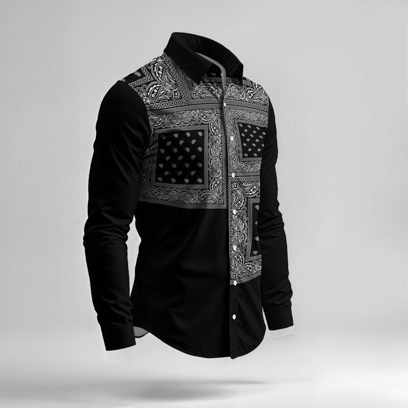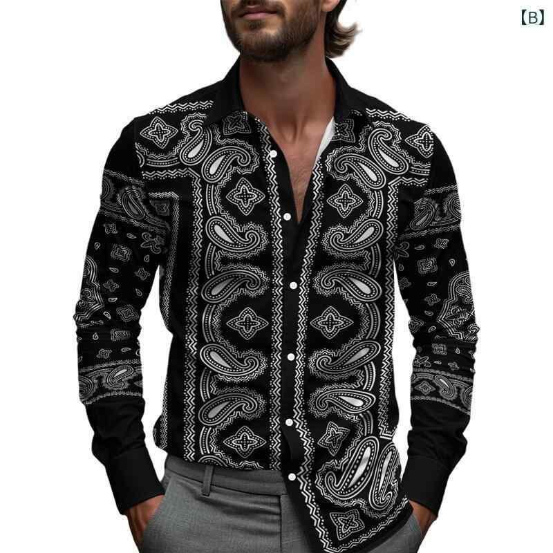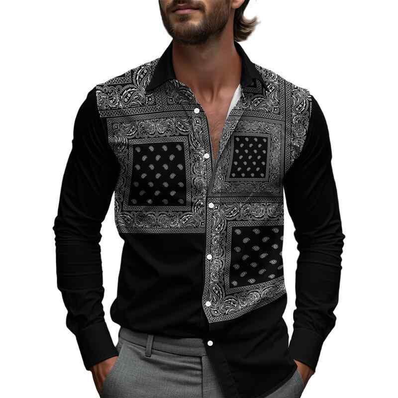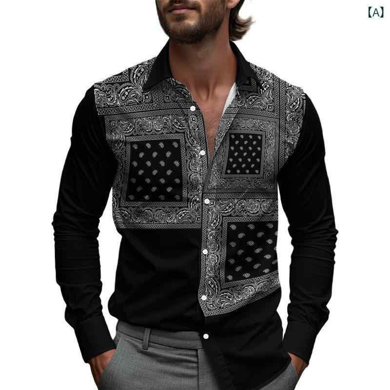 シャツ メンズ 男性用 ペイズリー柄 プリント ゆったり ルーズフィット 襟付き シングルブレスト 前開き 長袖 ロングスリーブ 軽量 高級感 ポリエステル混紡 吸湿速乾 耐久性 カジュアル デイリーユース 大人カジュアル