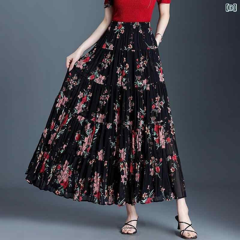 スカート レディース レトロ エレガント 小花柄 ハイウエスト Aライン ロングスカート ゆったり 細見え ポリエステル 伸縮性 カジュアル 普段使い 通勤 オフィス 着回し
