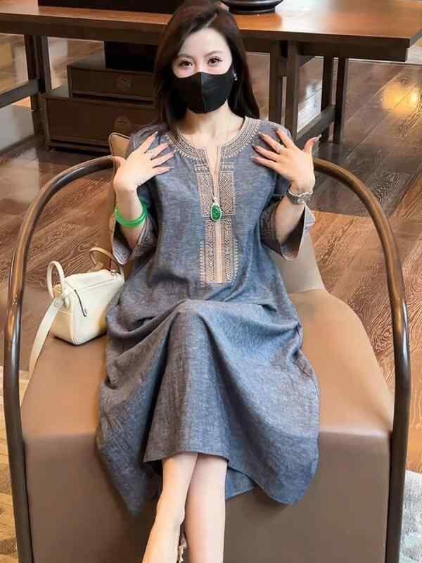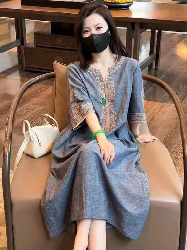 ワンピース レディース Vネック 刺繡 エスニック ロング丈 プルオーバー ゆったり 着痩せ効果 小花柄 Aライン 綿 五分袖 レトロ 上品 カジュアル 普段使い リラックス
