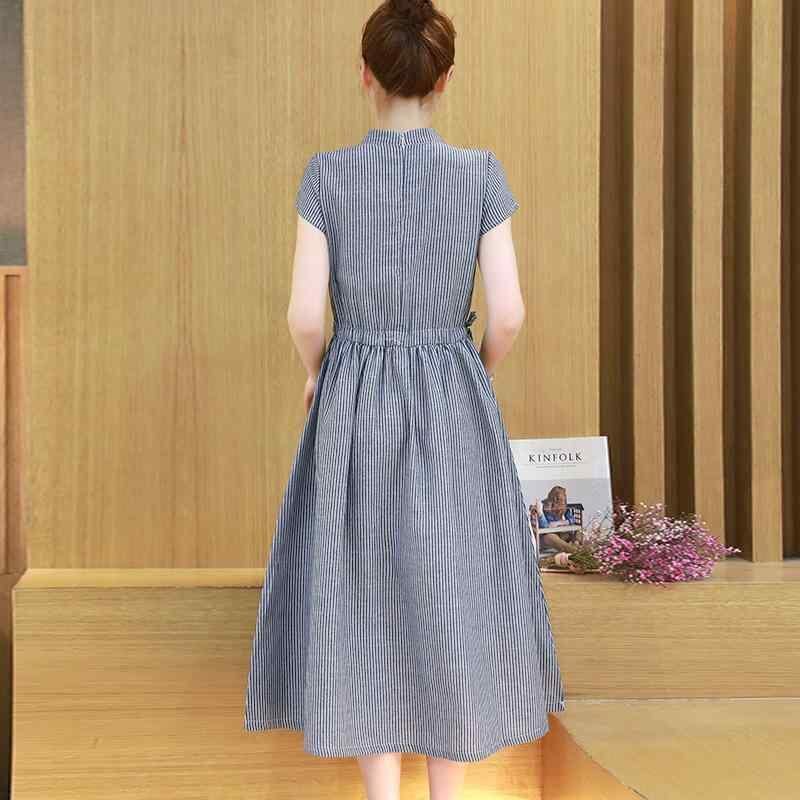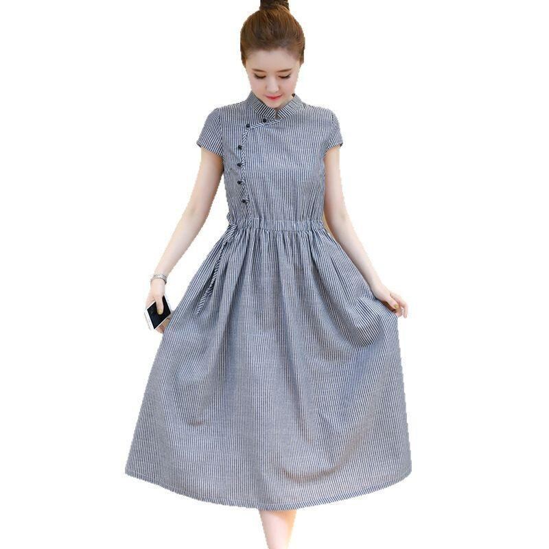 ワンピース レディース 綿素材 半袖 ハイウエスト Aライン 無地 上品 ミドル丈 膝丈 チャイナドレス風 レトロ 多色展開