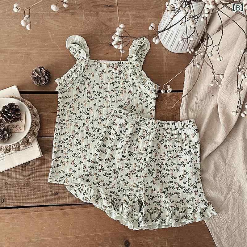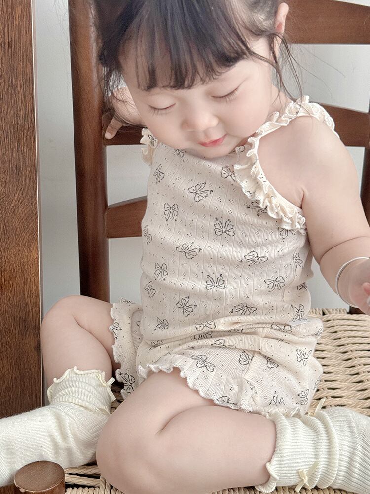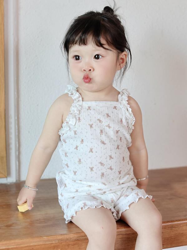 キッズ 女の子 女児 ショートパンツ セットアップ 上下セット 夏 夏物 綿100% フリル 花柄 小熊柄 リボン柄 かわいい 韓国風 柔らか素材 普段着 部屋着