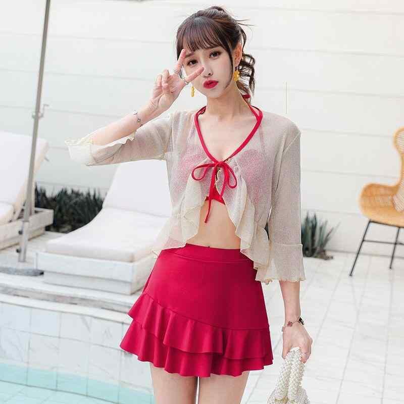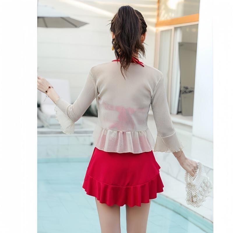 水着 レディース セパレート 3点セット 長袖 ラッシュガード スカート付き ショートパンツ 体型カバー 露出控えめ スポーツ 運動用 温泉 スパ プール 海水浴 カップ付き ノンワイヤー ポリエステル素材 レッド 赤
