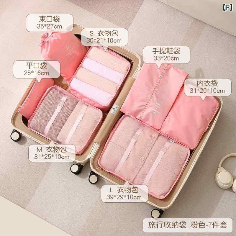 ・セットアイテムサイズ: フラットポーチ 約26×17cm、シューズバッグ 約32×22.5×14.5cm、パジャマバッグ 約32×22×10cm、下着バッグ 約22×18×10cm、衣類バッグM 約32×28×16cm、衣類バッグL 約42×32×16cm、7マス仕切りバッグ 約32×12×12cm