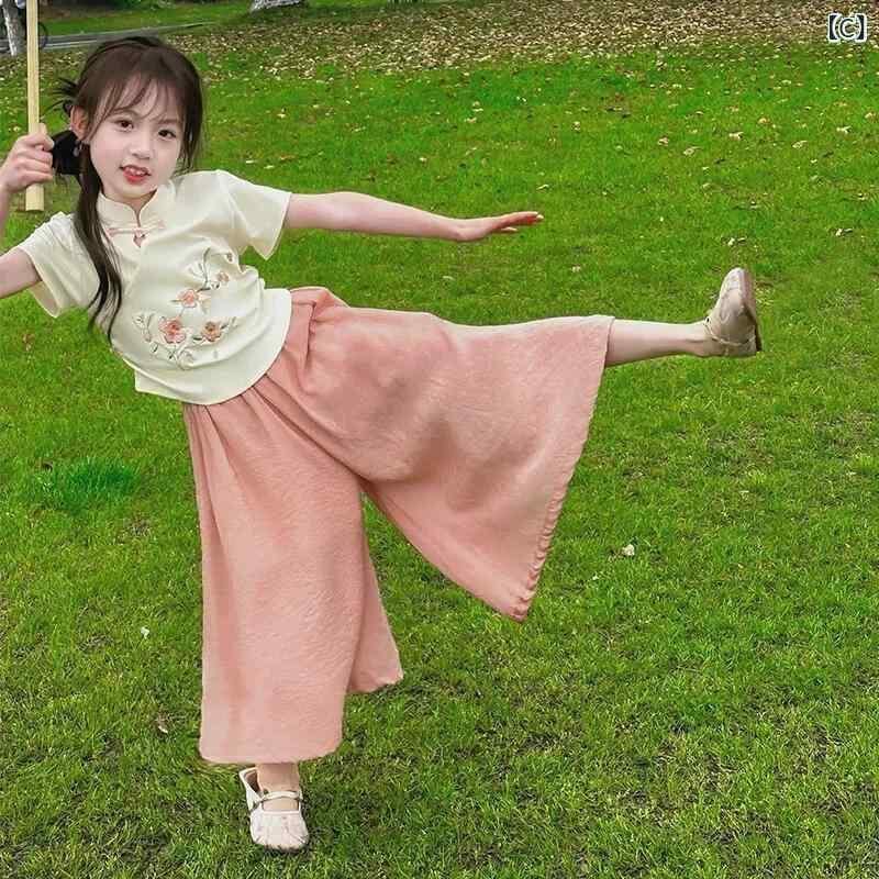 セットアップ 女の子 キッズ 夏服 漢服風 中国風 新中華スタイル レトロ 民族衣装 半袖 9分丈パンツ 2点セット 綿 薄手 軽量 ソフトな肌触り 普段使い お出かけ イベント 発表会 ピンク グリーン