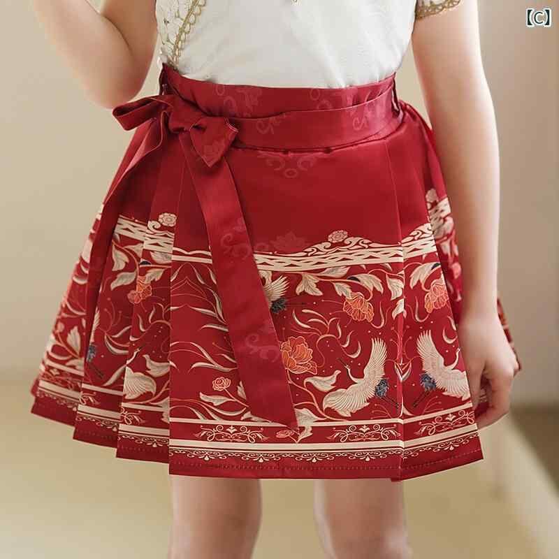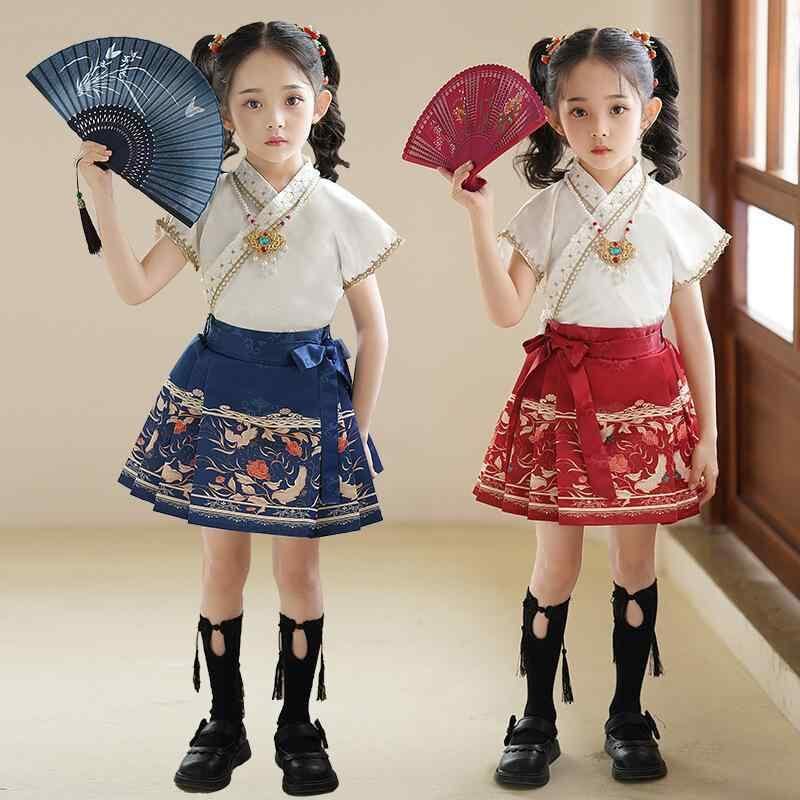 漢服セット キッズ 女の子 明朝様式 古風 中国伝統衣装 民族衣装 エスニック 馬面スカート プリーツスカート 上下セット ツーピース 夏物 ポリエステル 再生繊維