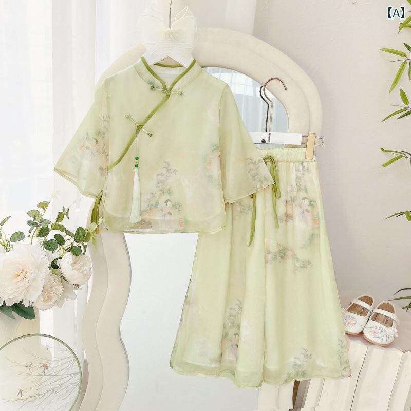 漢服 キッズ 女の子 ガールズ 夏服 ショート丈 セットアップ 中国風 新中国風 唐装 古典衣装 民族衣装 レトロ フリンジデザイン 普段使い カジュアルスタイル 通気性 軽量