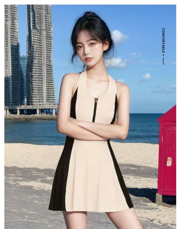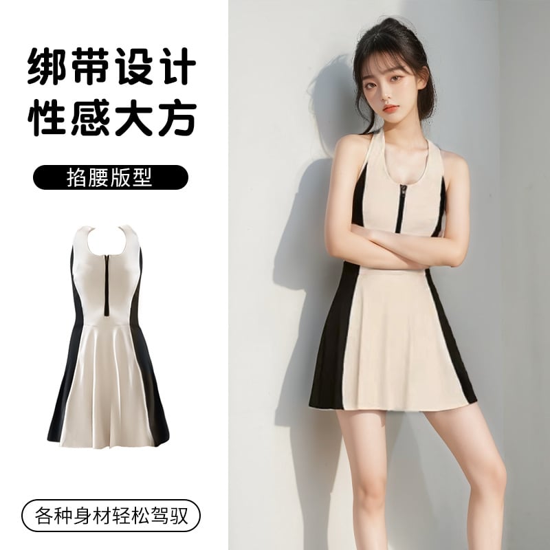 水着 レディース ワンピース スイムウェア スカート 体型カバー スポーツ ホルターネック ショートパンツタイプ 胸パッド付き ノンワイヤー 細見え 韓国風 再生繊維 ポリエステル ランニング 水泳 マリンスポーツ ビーチ プール アウトドア アイボリー