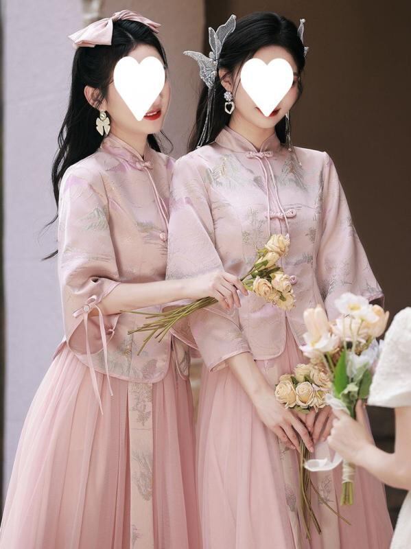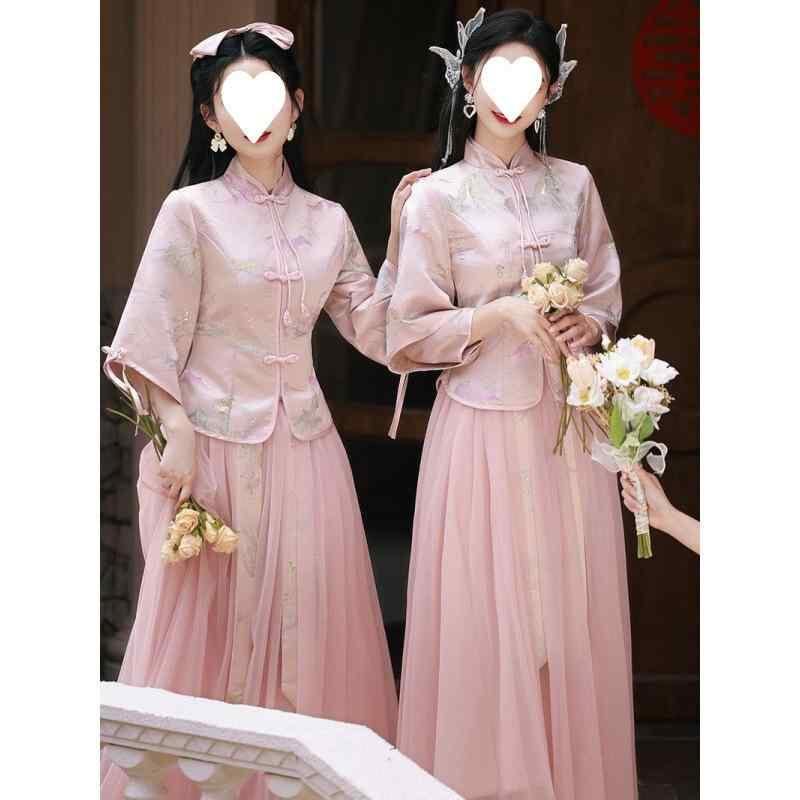 チャイナドレス レディース ブライズメイドドレス 結婚式 お呼ばれ フォーマル ロングドレス パーティードレス 秋冬 スタイルアップ 細見え ピンク チャイナ柄