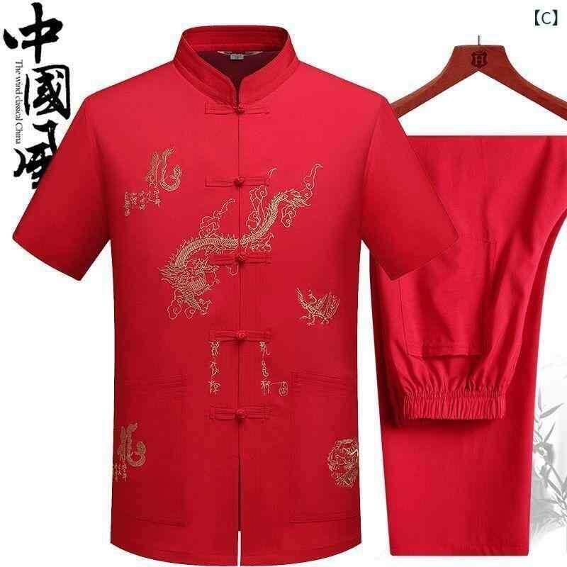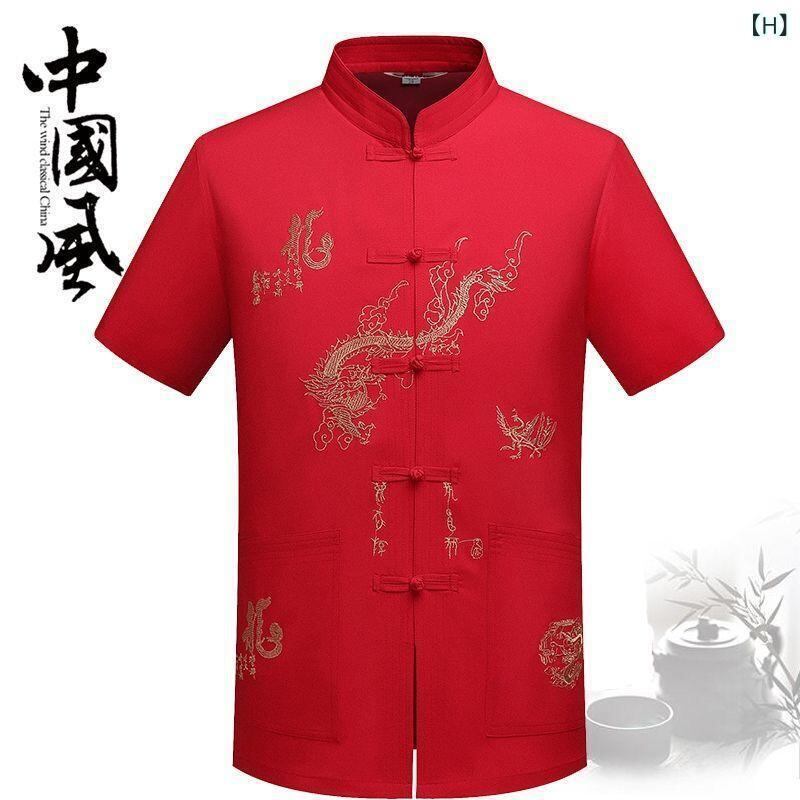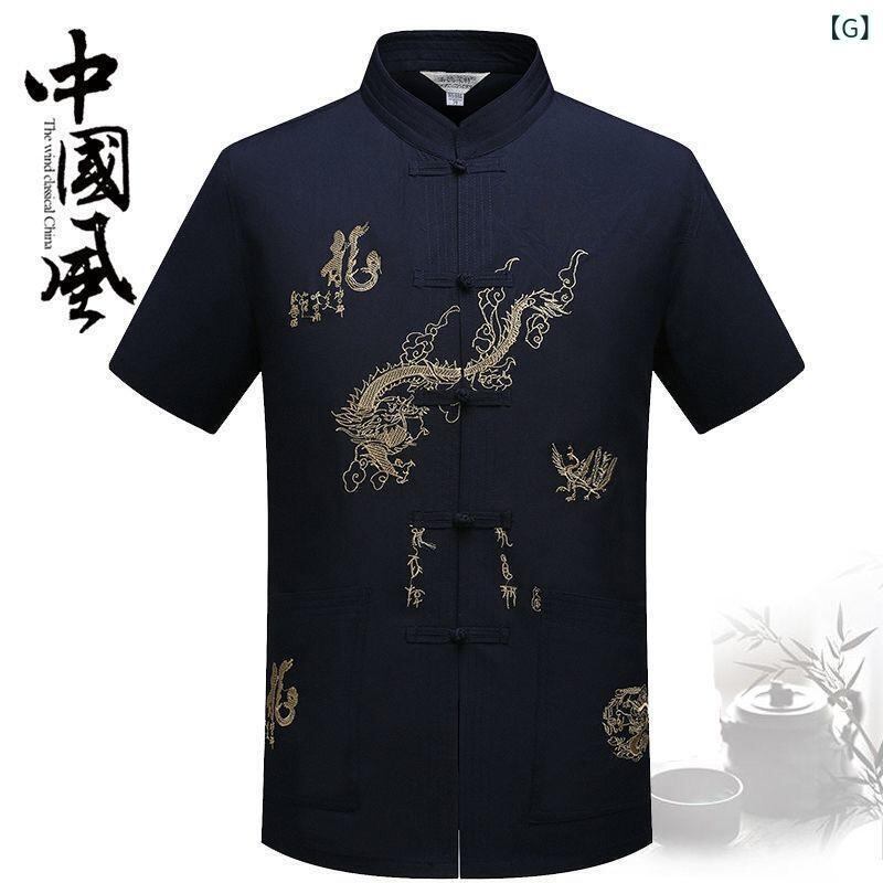セットアップ メンズ 男性用 シニア 中高年 お父さん おじいちゃん 夏用 半袖 シャツ 上下セット 太極拳服 カンフー服 中華風 龍刺繍 リラックスウェア ホームウェア 大きいサイズ ゆったり ポリエステル混紡