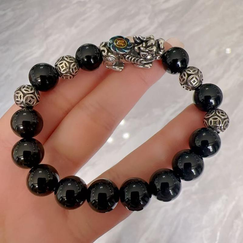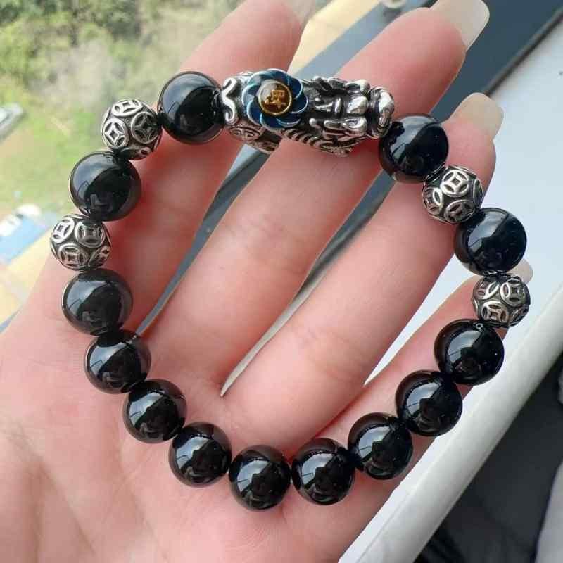 ブレスレット 男女兼用 黒曜石 天然石 貔貅 銭形ビーズ カップル ペア 数珠 パワーストーン 金運 魔除け お守り レトロ エスニック 民族風 おしゃれ カジュアル 普段使い
