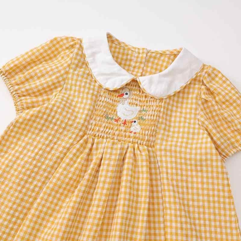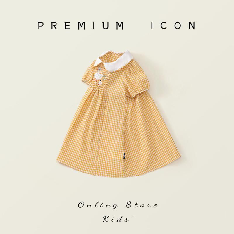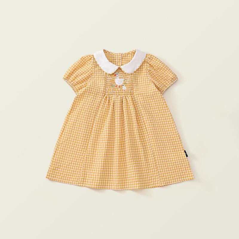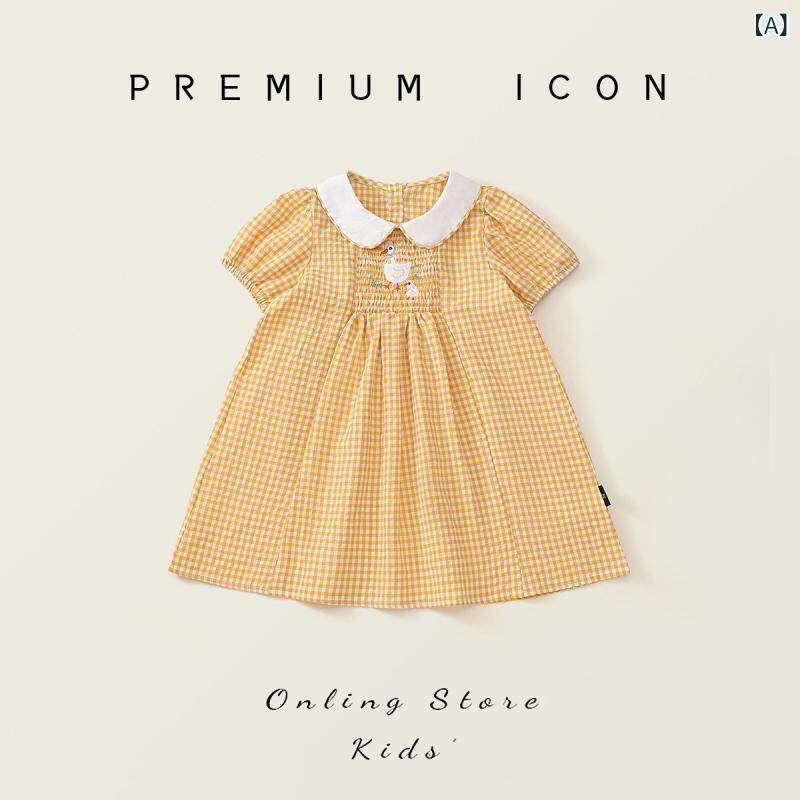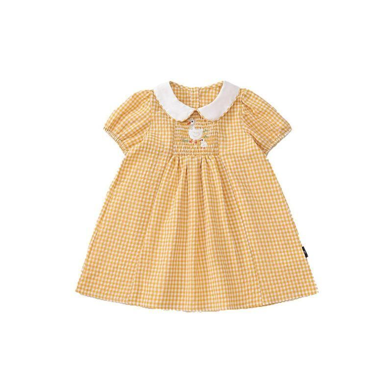 ワンピース キッズ ガールズ 子供 黄色 イエロー 格子柄 チェック スモッキング 刺繍 レトロ風 襟付き 半袖 プリンセスドレス コットンブレンド 柔らかい肌触り ソフトな着心地 お出かけ 普段使い カジュアル