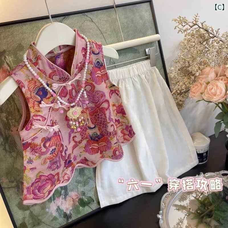 子供服 セットアップ 女の子 キッズ 中華風 チャイナボタン ノースリーブ 九分丈 パンツ 夏 薄手 綿素材 柔らかな肌触り 普段使い おしゃれ かわいい 抽象柄