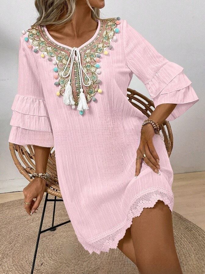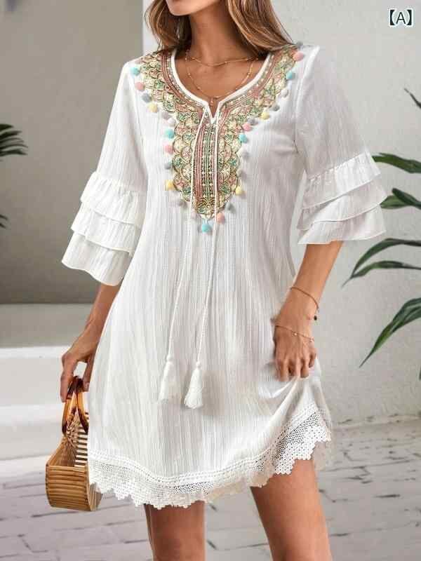 ワンピース レディース カラフル ポンポン フリンジ 無地 フリル袖 5分袖 Aライン ミニ丈 丸首 カジュアル ボヘミアン ポリエステル素材 刺繍デザイン