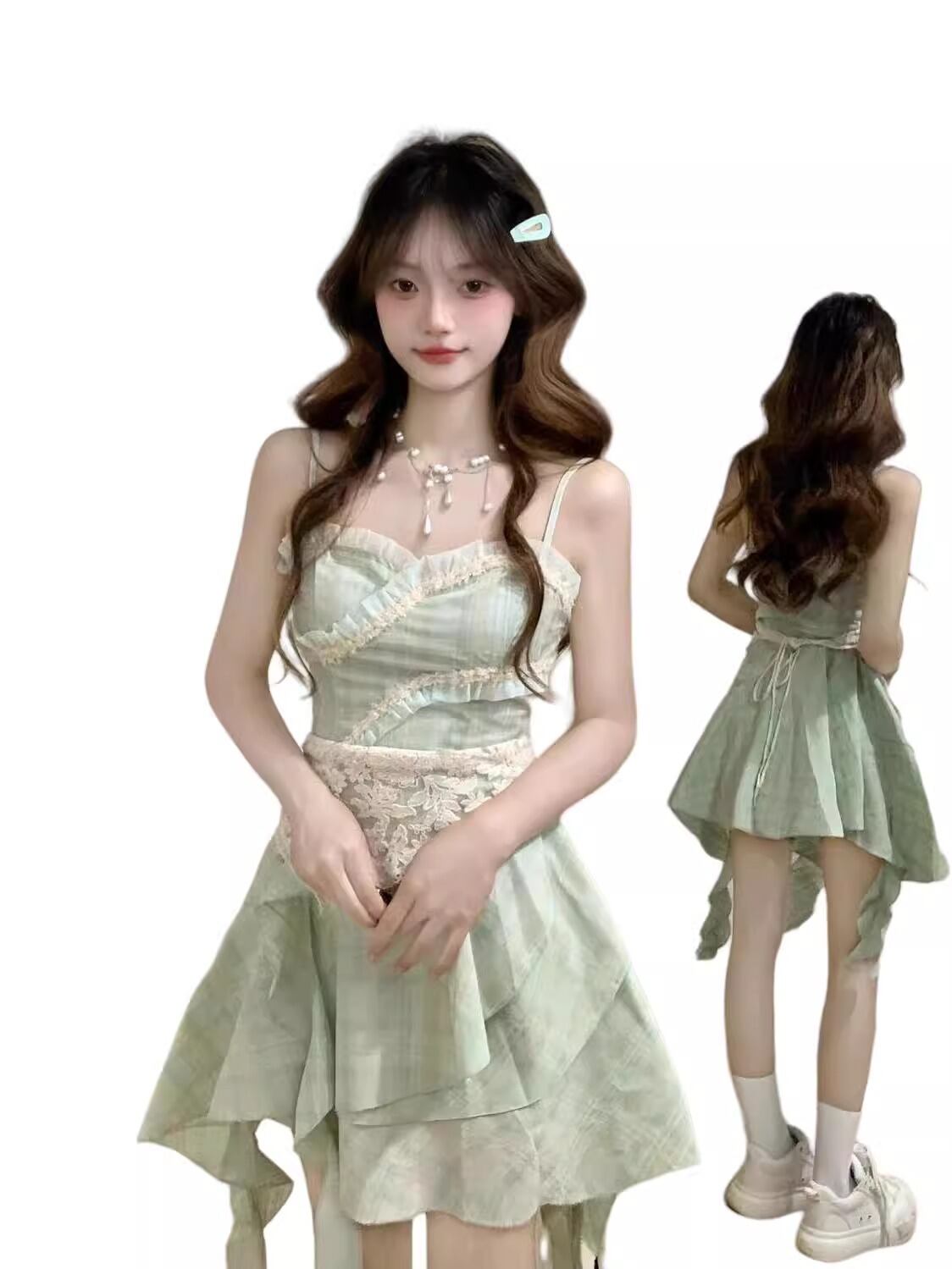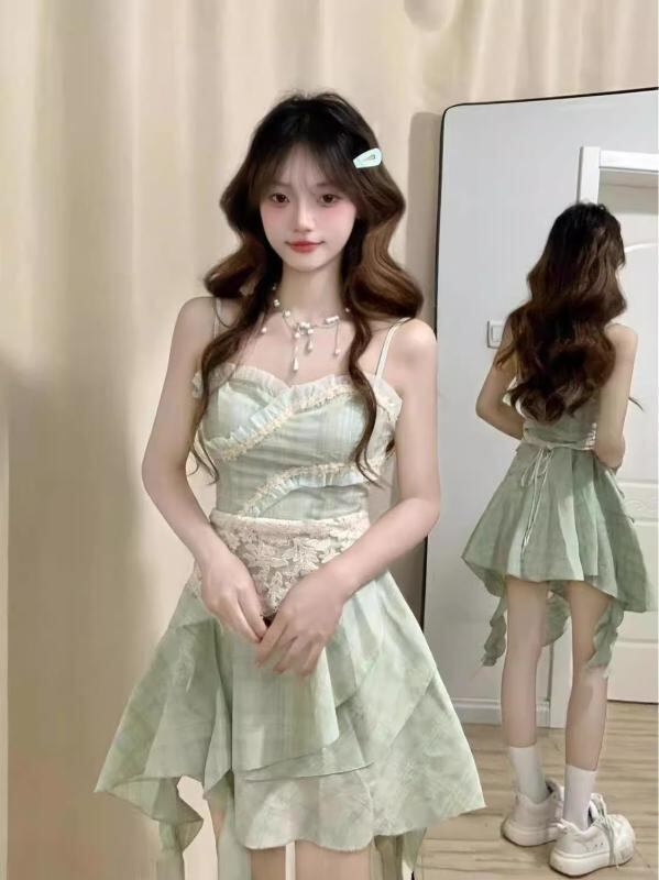 ワンピース レディース スウィート フェミニン キャミソール ミニ丈 Aライン ウエストシェイプ 細見え 上品 ライトグリーン ポリエステル メロウフリル お出かけ デート
