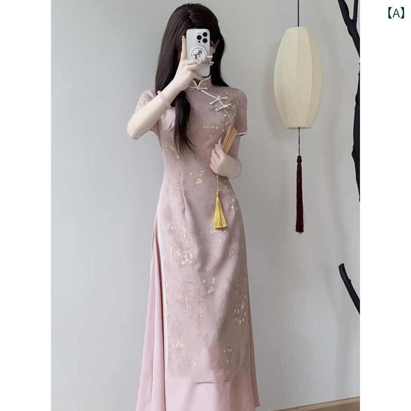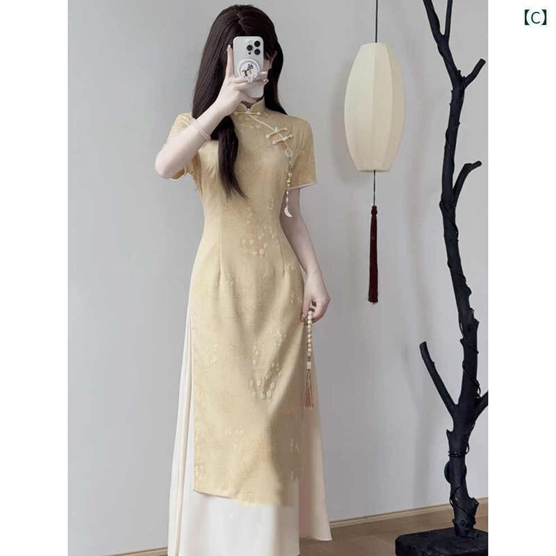 チャイナドレス アオザイ風 レディース イエロー 新チャイナ 改良デザイン 若々しい 上品 エレガント ミドル丈 ノースリーブ ポロ襟 シェニール スパンデックス 大人カジュアル きれいめ