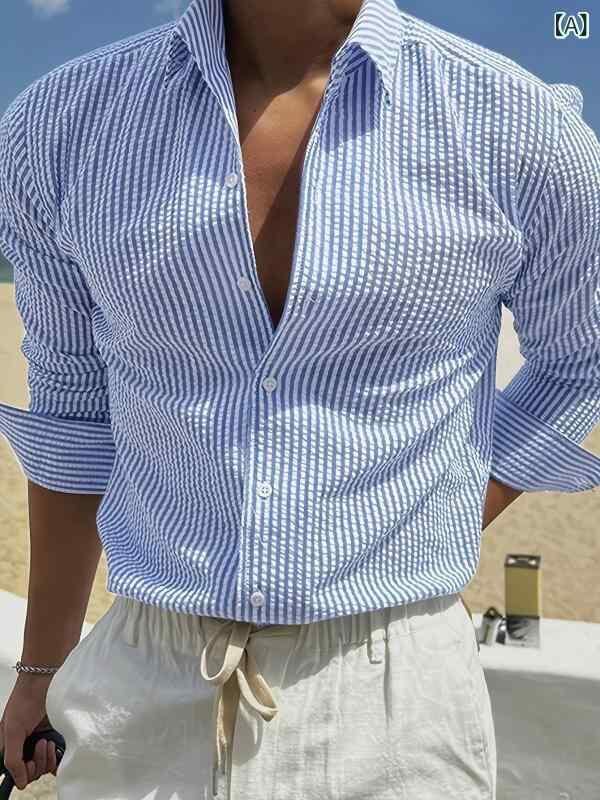 シャツ メンズ ティーンズ ストライプ 長袖 スリムフィット 開襟シャツ ポリエステル 日常使い カジュアル スカイブルー ブルー系