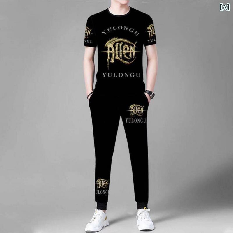 半袖Tシャツ メンズ 男性用 セットアップ 上下セット カジュアル トレンド 着回し スタイリッシュ クール ポリエステル 9分丈 クロップドパンツ 普段着 リラックスウェア