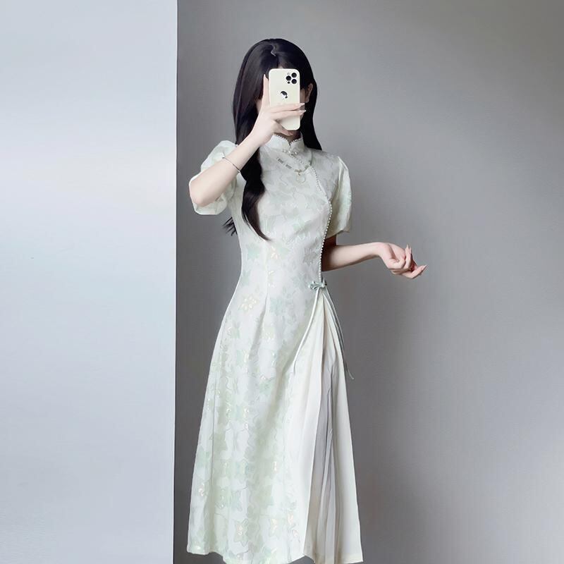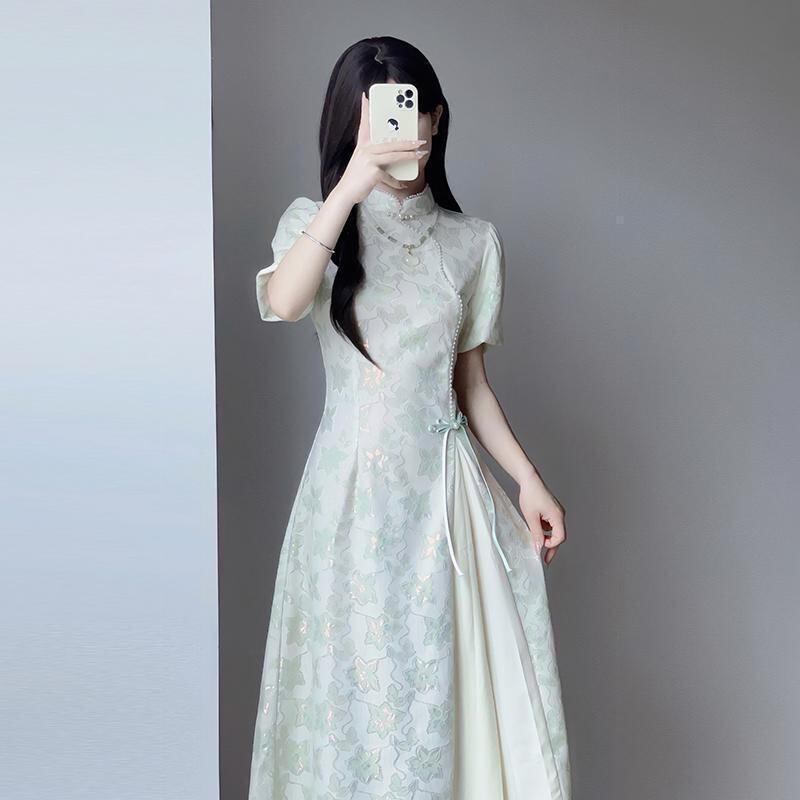 ワンピース レディース 改良型チャイナドレス 新中華風 ロング丈 ホルターネック 斜め襟 フリル袖 絵柄 レース ポリエステル 上品 エレガント 普段使い 通勤 オフィス デイリー シティスタイル グリーン ピンク ベージュ