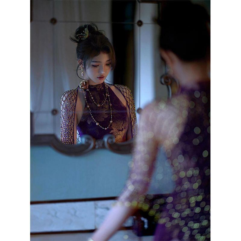 ワンピース レディース チャイナ風 改良型 ホルターネック ノースリーブ タイト ロング丈 高級感 エレガント セクシー プリント プリーツ 異素材ミックス レッド