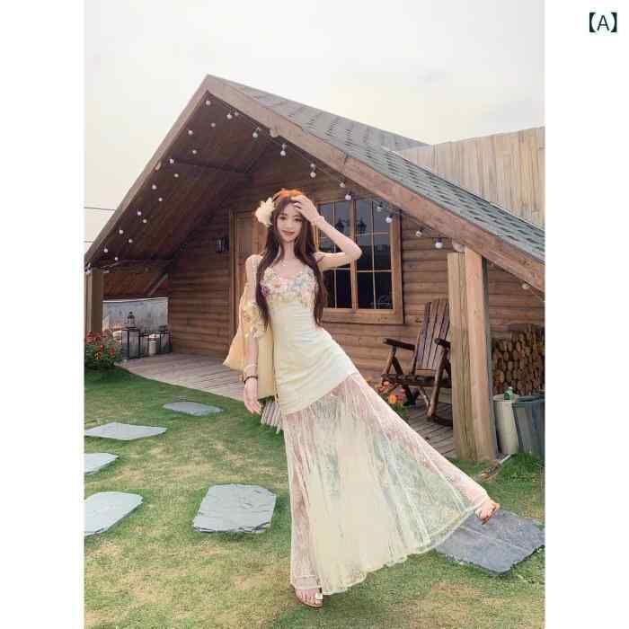 ワンピース レディース フレンチエレガント 凝ったデザイン 花柄 レース チュール 切り替え キャミソール ハイウエスト マーメイドライン ロング丈 ポリエステル リゾートスタイル 通勤 オフィス デイリー 上品 ホワイト