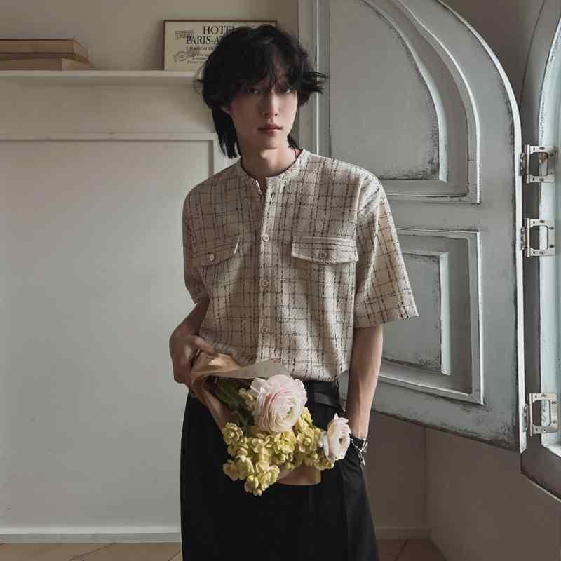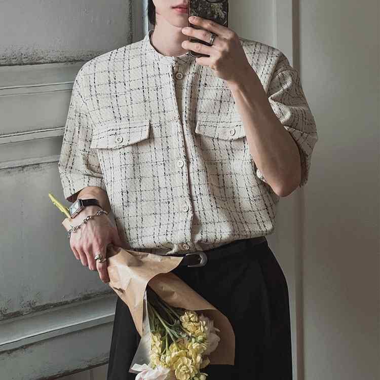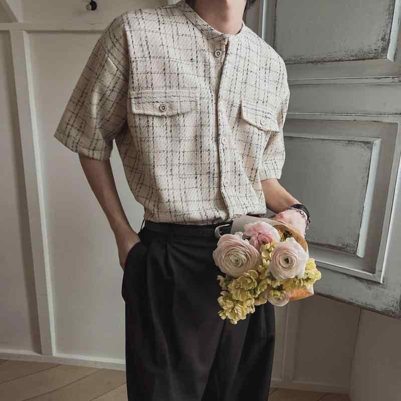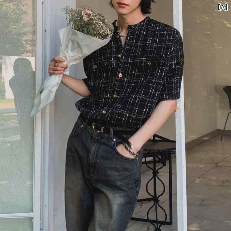 シャツ メンズ 半袖 丸襟 前開き ストライプ ゆったり ルーズフィット カジュアル 韓国風 通勤 デイリーユース 普段使い ポリエステル 耐摩耗 イージーケア ノーアイロン