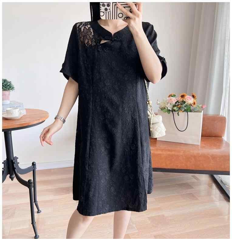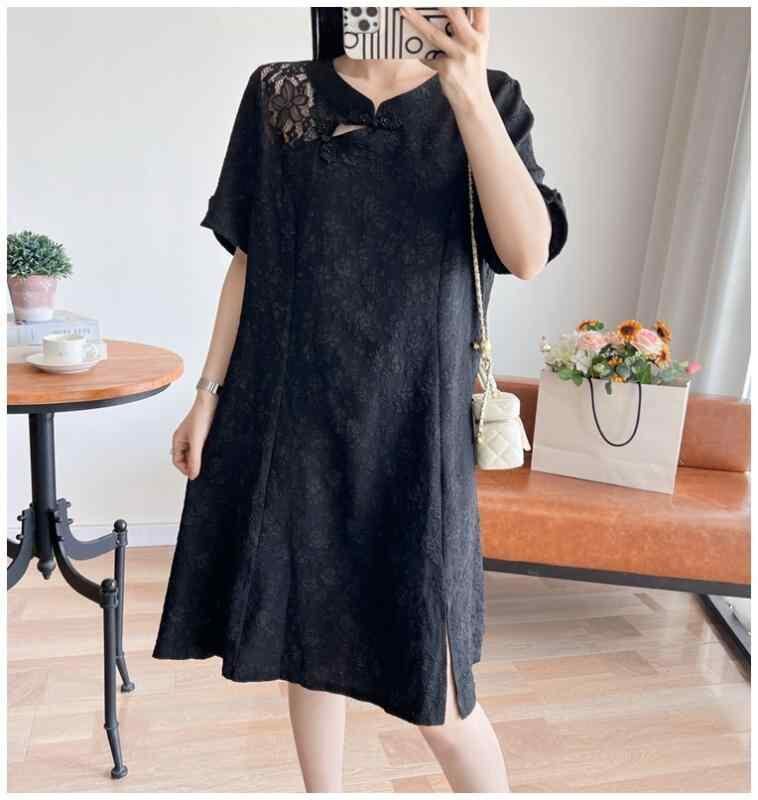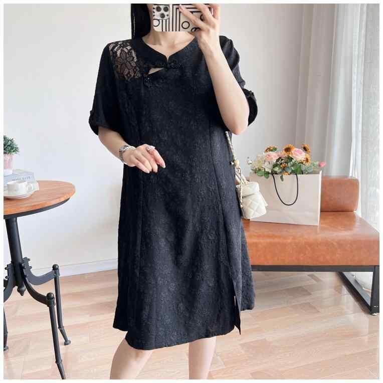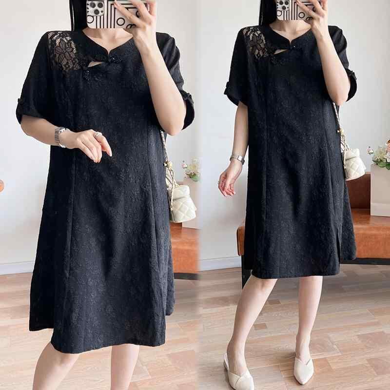 ワンピース レディース 大きいサイズ ゆったりサイズ 改良 旗袍 レトロ風 半袖 五分袖 夏 ミモレ丈 Aライン Vネック ポリエステル ブラック カジュアル