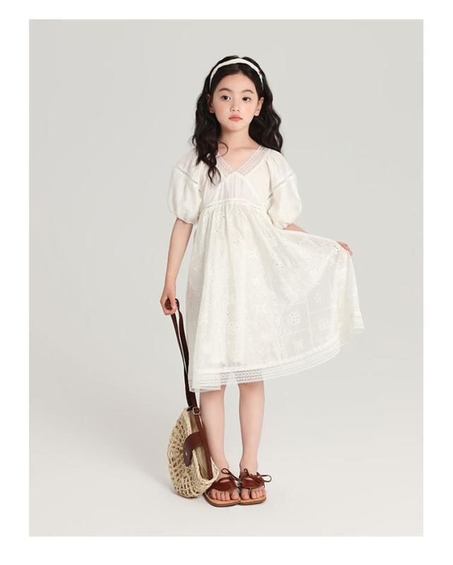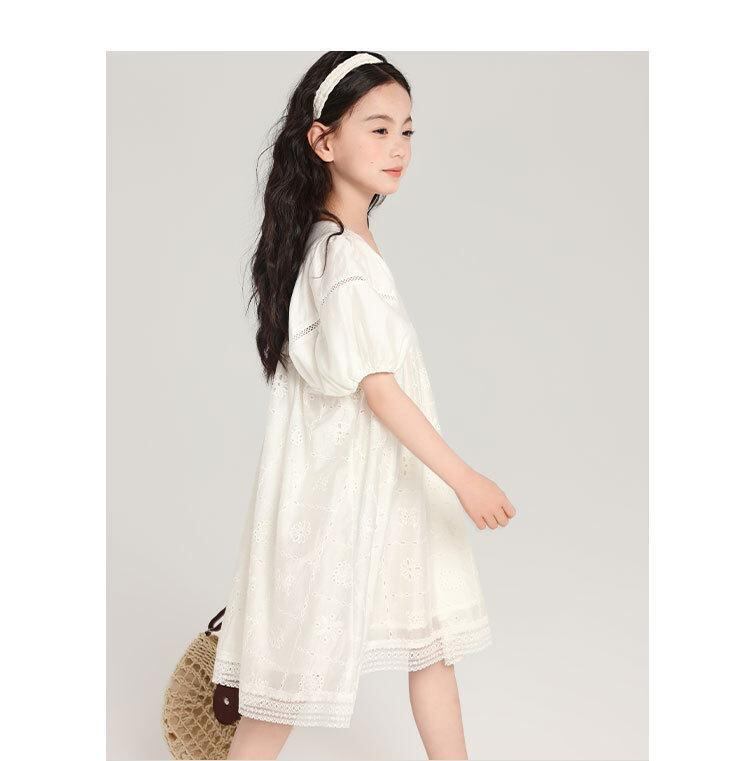 ワンピース 女の子 子供 リヨセル 再生繊維 夏物 韓国風 おしゃれ かわいい レースフリル パフスリーブ Aライン 無地 ベージュ カジュアルドレス 普段使い