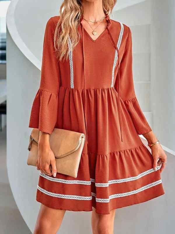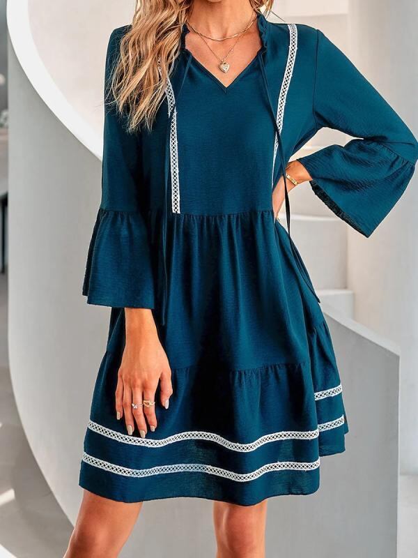 ワンピース レディース シンプル カジュアル Vネック プリーツ 半袖 フード付き レース ミディ丈 フレアスカート ポリエステル 普段使い お出かけ