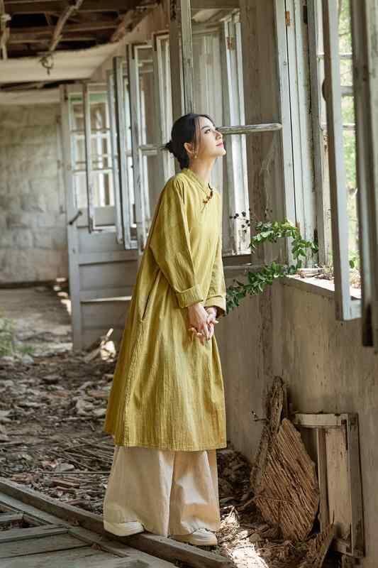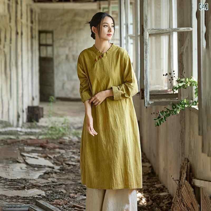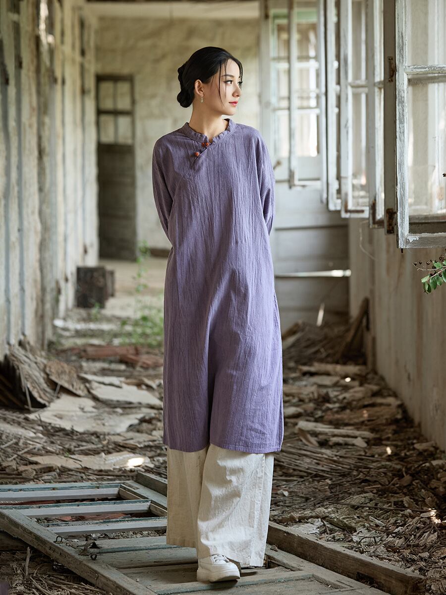 ワンピース レディース 改良チャイナワンピース 絞り染め ゆったり 体型カバー ミモレ丈 Aライン 中華風 スタンドカラー 長袖 ラミー 綿混 レトロ ヴィンテージ リラックス
