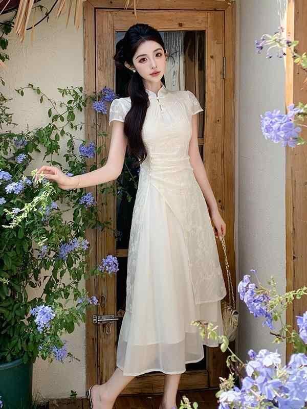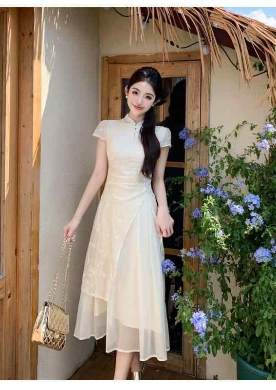 ワンピース レディース 新チャイナドレス 刺繍 ウエストマーク 着痩せ効果 エレガント 上品通勤 ミディ丈 フレアスカート ハイウエスト 長袖 パフスリーブ チャイナカラー アプリコット