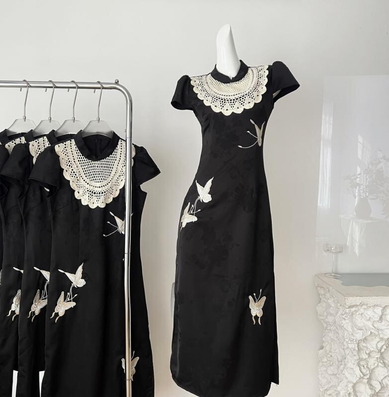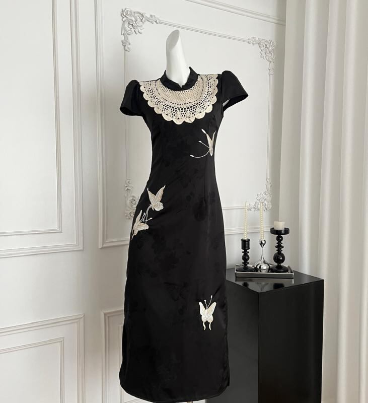 ワンピース レディース 新中式 チャイナドレス レトロ 改良 旗袍 サテン 蝶柄 刺繡 ポリエステル レーヨン ミディ丈 Aライン ラウンドネック 半袖 ハイウエスト 切り替え エレガント 上品