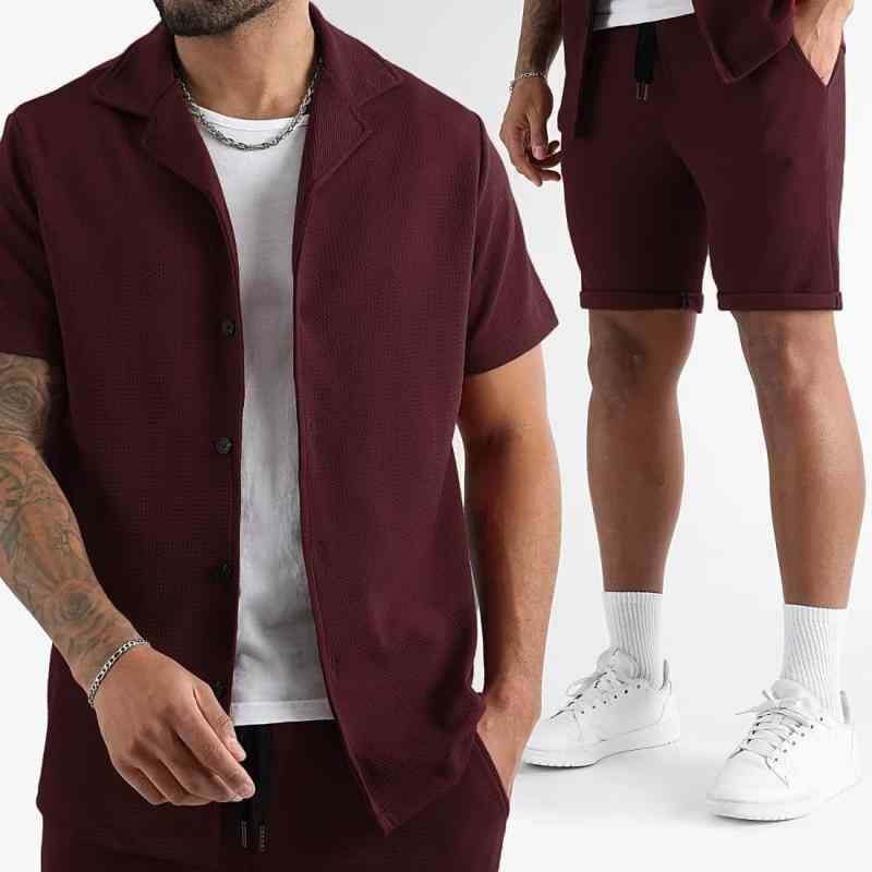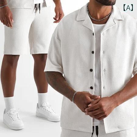 シャツ メンズ 半袖 オープンカラー 無地 前開き セットアップ 上下セット カジュアル リラックス 普段使い ポリエステル 化学繊維混紡 ウォッシャブル ノーアイロン 形状記憶