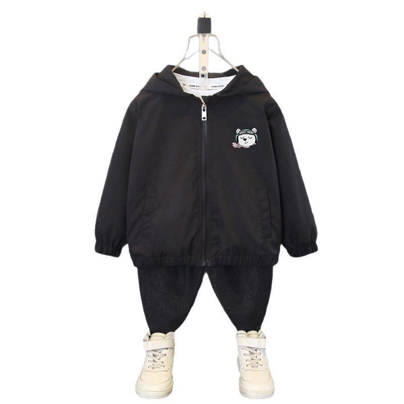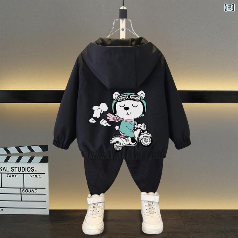 アウター 男の子 子供 ジュニア 春秋 フード付き 長袖 フルジップ ジャケット ウィンドブレーカー カジュアル アウトドア ポリエステル 柔らか素材 モーターベア柄 ショート丈