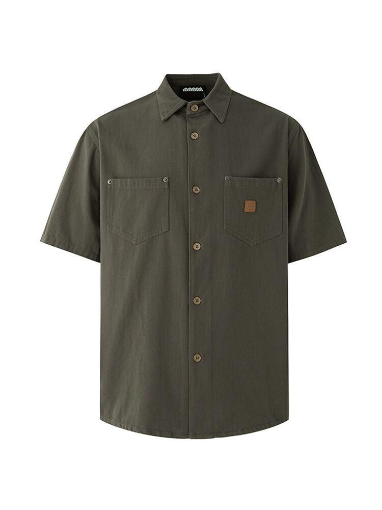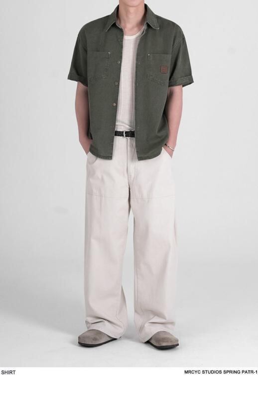 シャツ メンズ 半袖 夏物 レトロ ワークシャツ カジュアル ゆったり ルーズフィット オーバーサイズ 韓国風ファッション 通勤 オフィス 普段使い 無地 薄手 軽量 綿 コットン 耐摩耗性 カーキ グレーグリーン