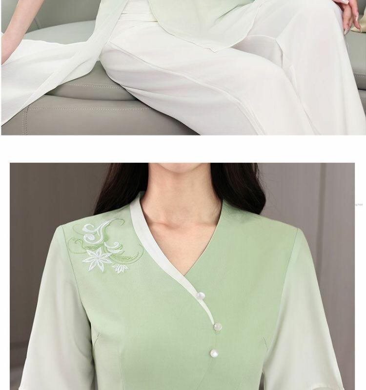 ユニフォーム レディース エステ サロン リラクゼーション 施術 接客 ウェア シェニール スパンデックス 七分袖 ドルマンスリーブ Vネック ショート丈 防寒 伸縮性 カジュアル 動きやすい